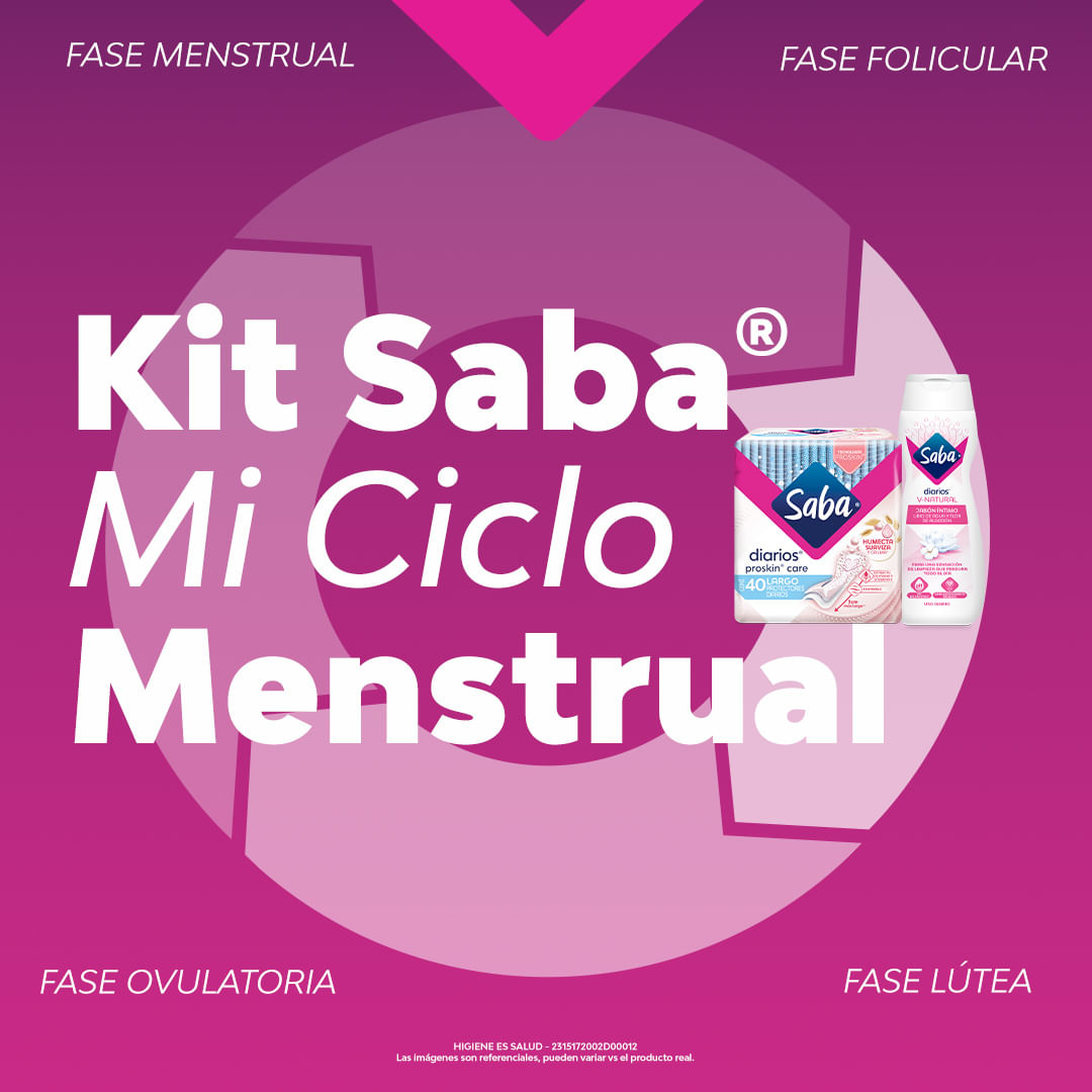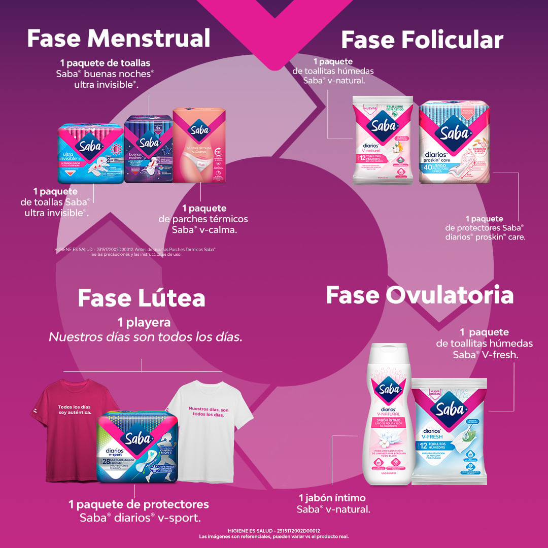Con el Kit Saba® Mi Ciclo Menstrual conoce las 4 fases del ciclo: Menstrual, lútea, folicular y ovulatoria y vivirlo cómoda y protegida.