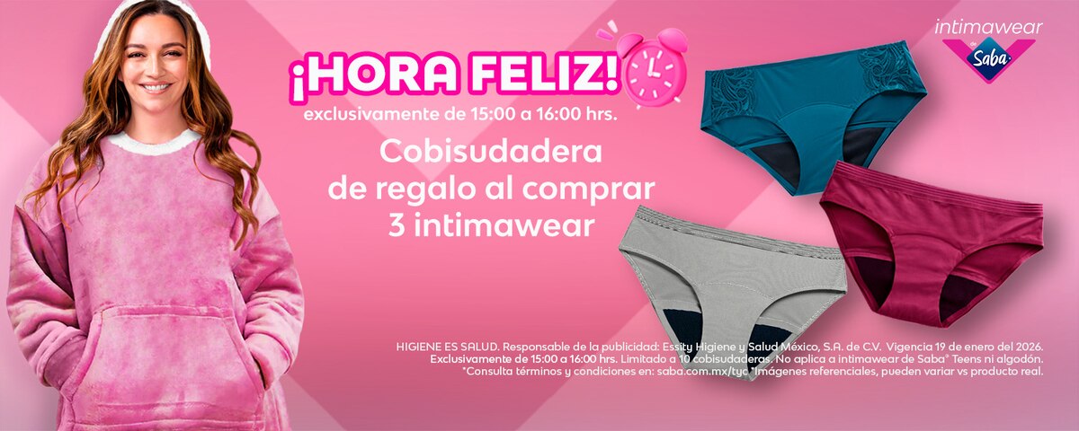 Por la compra de 3 calzones menstruales reutilizables intimawear de Saba®, recibe 1 cobisudadera de regalo al finalizar tu compra. Promoción limitada a 10 cobisudaderas.
