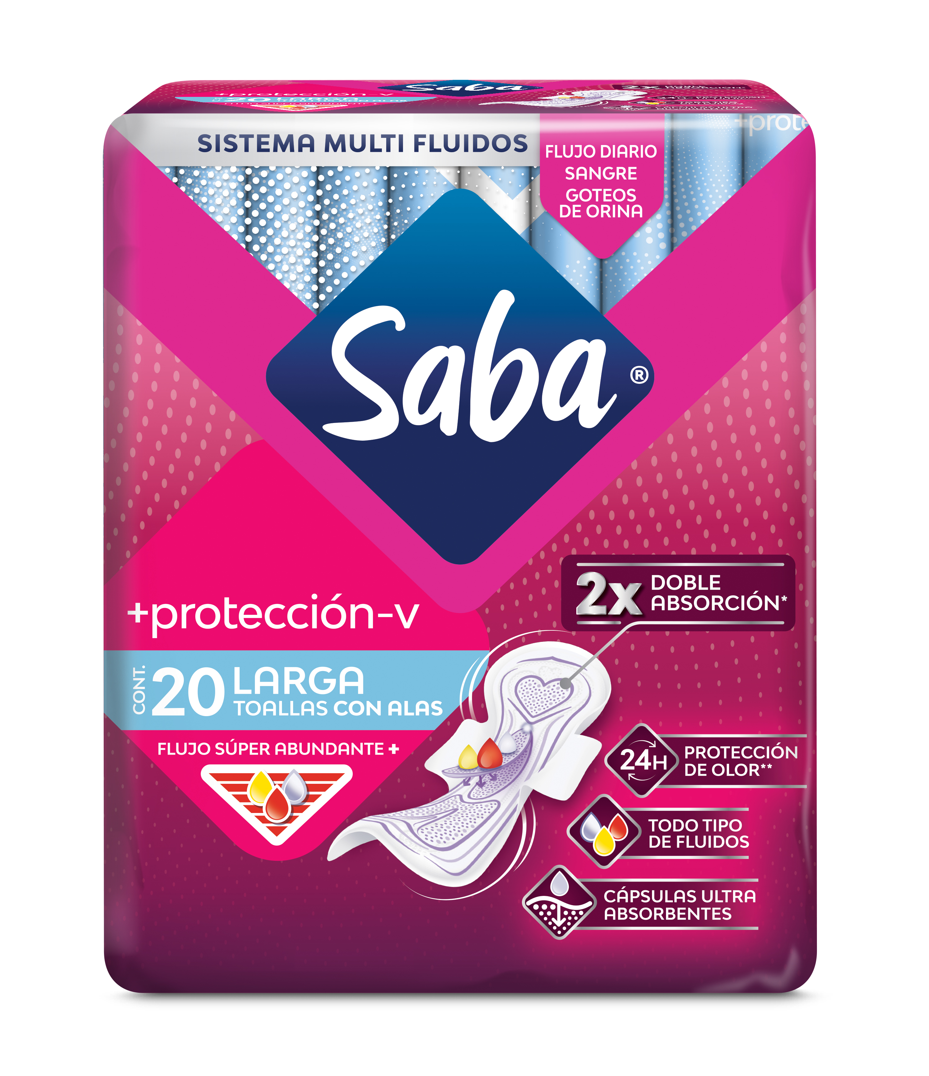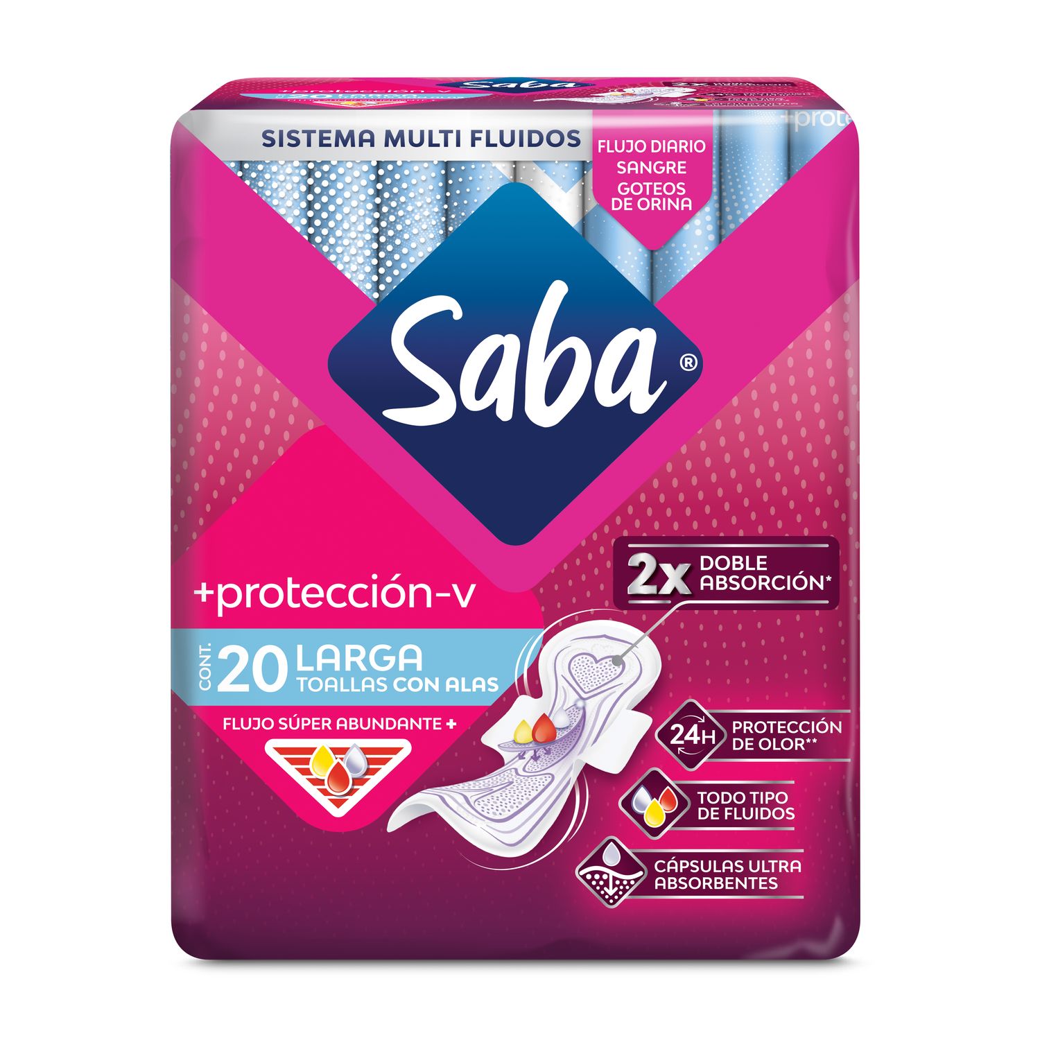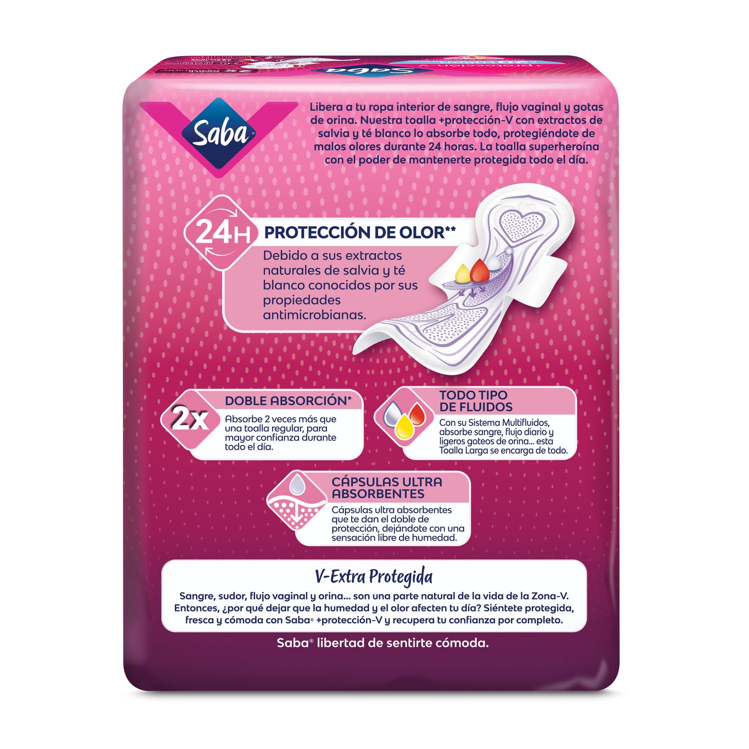 Las Toallas Femeninas Saba® +protección-v están diseñadas para ofrecer una protección integral para todo tipo de fluidos, incluyendo sangre, flujo vaginal y ligeras pérdidas de orina. Absorben eficazmente y proporcionan una protección contra malos olores durante 24 horas, gracias a sus cápsulas ultra absorbentes brindándote seguridad y comodidad todo el día.