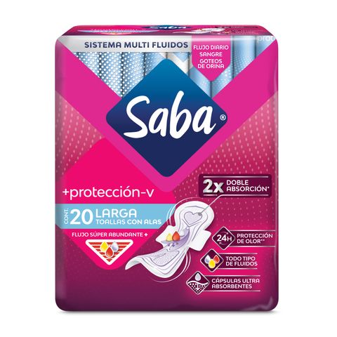 Saba® +protección-V Toalla Larga con Alas Flujo Súper Abundante 20 Piezas