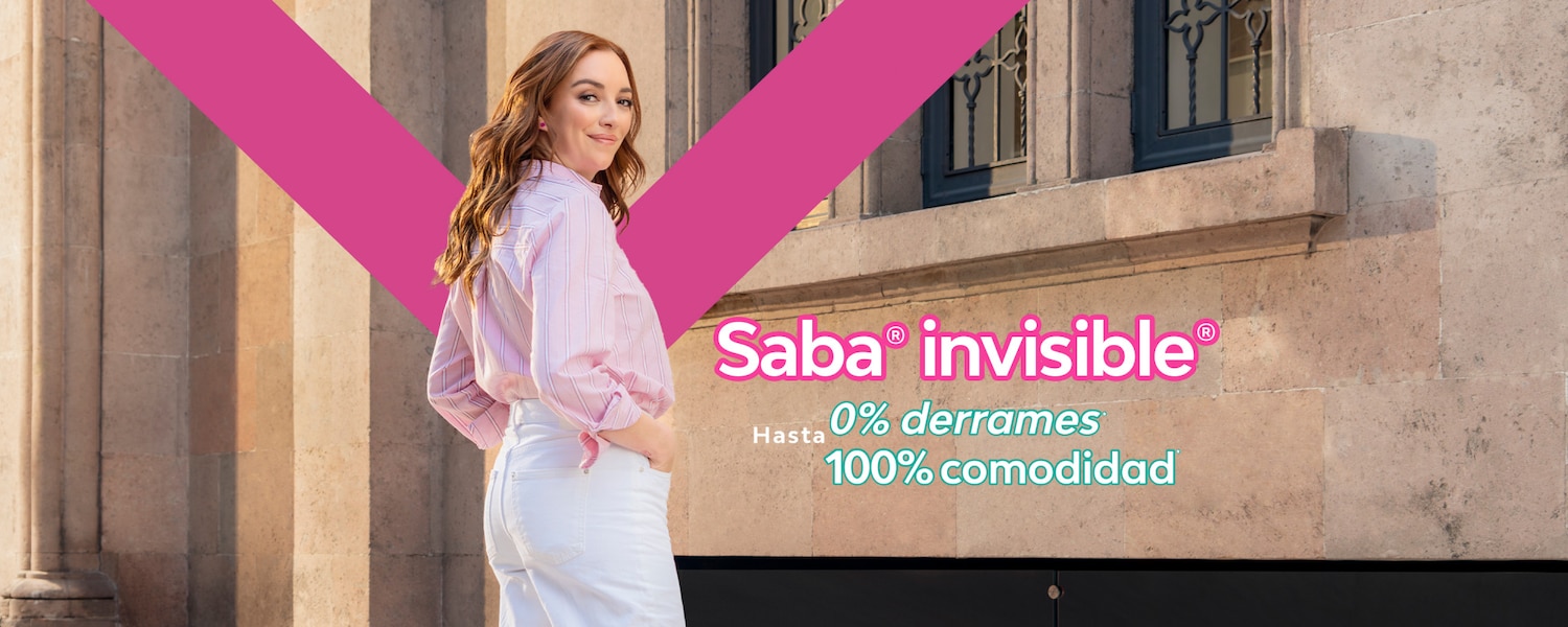 Saba® invisible® ofrece una absorción ideal para aquellas personas que son hasta de flujo abundante. Una de sus características principales es que es más delgada que una toalla regular, dándote mayor ajuste y comodidad. Cuenta con el nuevo sistema SmartProtectTM que, con su nuevo centro súper absorbente y sus canales interconectados, te darán hasta 0% derrames* y hasta 100% comodidad*.